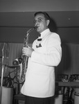 Dick Dickerson, orchestra leader, seen playing a saxophone at the microphone in hotel Texas.
