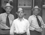 Colorado City roundup boosters. Left to right, Jack Shelton, secretary of Colorado City chamber of commerce; bob May ranchman and Sheriff R. E. Gregory of Mitchell County, seen standing side by side each other outside.