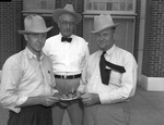 Colorado City roundup boosters. Left to right, harold Bennett, C. C. Thompson, and Mayor J. A. Sadler of Colorado City, seen standing outside looking at a piece of paper. Sadler is seen holding a cigarette in his hand.