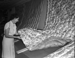 Mrs. Woody Hall, president of the North Star Home Demonstration Club shown with a display of feather comforts at the Rising Star Fair.