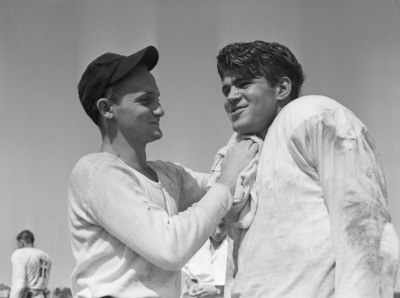 Texas Christian University football student manager Preston Thompson and player Frank Kring, fullback. Mr. Thompson is wearing a long-sleeved shirt and a hat while Mr. Kring is wearing his uniform with a jersey over his shoulder pads. The two men are standing and facing each other while Mr. Thompson holds a towel to Mr. Kring's neck. Star-Telegram Evening, September 6 1940.
