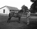 Frank C. Evans, outside holding the leash of his five-gaited saddle horse.