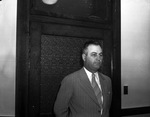 H. D. Plate, assistant to head cattle buyer at Armour and Company, shown standing in front of a closed door dressed in suit and tie.