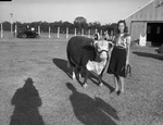 Mary Patterson of Virginia Beach, Virginia, shown standing beside white-faced Hereford named Blue Bonnet 20th, outside of a ranch in Corsicana, Texas. Miss Patterson is wearing a blouse and knee-length skirt.