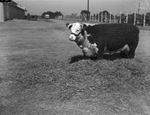 Blue Bonnet Domino 20th, reserve champion female Hereford of the Corsicana, Texas show, standing in a field over a pile of hay. She is owned and was exhibited by Allison and Allison.