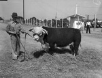 Prince Return Paladin 9th, a white-faced Hereford owned by Doctor Charles H. Harris, shown standing in a gated field over a pile of hay in Corsicana, Texas. Dr. Harris, left, is holding the Hereford by a leash and is wearing a cowboy hat, long-sleeved button down shirt and trousers.