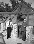Roy Bowden, left, and John Tom Bowman inspecting framework for new housing quarters at Camp Wolters, Texas National Guard cavalry camp near Mineral Wells, Texas. The tent framework is made of brick and concrete floors and walls and timber rafters. Mr. Bowden and Mr. Bowman are both wearing hats and eyeglasses. Mr. Bowden is wearing a button-down shirt, necktie and trousers and Mr. Bowman is wearing a suit.