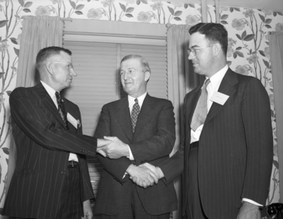 E. E. Bewley, center, is president of the State Reserve Life Insurance Company. He is offering a double handshake of congratulations to two West Texas agents. Together the company produced approximately $600,000 worth of business last year. They are C. N. Kennon, left, and Eugene F. Harris, right. Mr. Kennon, of Lubbock, Texas, is president of the Hustlers Club. He is wearing a chalk stripe suit. Mr. Bewley is dressed in a suit. Mr. Harris, of Plainview, Texas, is dressed in a pinstripe suit.