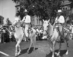Amon Carter (right) and an unidentified man riding on horseback in a parade in celebration of the premiere of the 1940 film, "The Westerner," in Fort Worth, Texas. Both men are wearing cowboy hats and cowboy boots and Carter is wearing a bandanna around his neck. At the left, spectators are watching the parade.