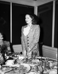 Dinner at Shady Oak Farm for Westerner personnel. A woman is standing behind a dining table. She is wearing a plaid coat, a blouse with a ruffled collar and a cowboy hat.