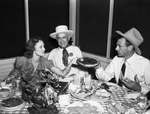 Dinner at Shady Oak Farm for Westerner personnel. Amon Carter (center), a man and a woman are seated at a dinner table. The woman at the left is passing a plate of food to the man.