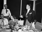 Dinner at Shady Oak Farm for Westerner personnel. Amon Carter (left, standing) and three others are gathered around a dining table. A man is standing at the far right, and another man and a woman are seated.