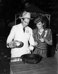 Dinner at Shady Oak Farm for Westerner personnel. A man and a woman are looking down at a cast iron skillet. The man is holding a cut of meat in one hand and a hotdog bun in the other.