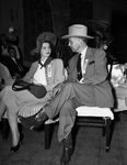 Dinner at Shady Oak Farm for Westerner personnel. A man and a woman are seated in chairs. The man is wearing a cowboy hat and cowboy boots. The woman has a purse in her lap.