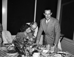 Dinner at Shady Oak Farm for Westerner personnel. Amon Carter (second from right, standing) and three others are gathered around a dining table. A man is standing next to Carter, at right, and another man and a woman are seated. Carter is showing something to the woman.
