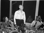 Dinner at Shady Oak Farm for Westerner personnel. Two men and two women are gathered around a dining table. The man second from left is standing and the others are seated. The woman sitting at the far right is partially out of frame.
