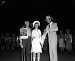 A photograph of two unidentified men and an unidentified woman, standing at a microphone at the premiere for the 1940 film "The Westerner." In front of the microphone is a banner for the KGKO Lone Star Chain radio station.