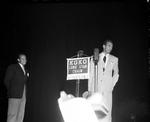 A photograph of an unidentified man standing behind two microphones at the film premiere for the 1940 film "The Westerner." In front of the microphones is a banner for the KGKO Lone Star Chain radio station.
