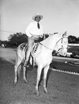 An unidentified man sitting on a horse at the film premiere party for the 1940 film "The Westerner" at Shady Oak Farm.