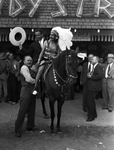 An unidentified woman and an unidentified man sit on a horse, with another unidentifed man standing next to the horse, at the film premiere party for the 1940 film "The Westerner" at Shady Oak Farm. The three unidentified people are possibly actors from the film. The woman is wearing a feather headdress and pointing at the man on the ground. The man on the horse is holding his hat out.