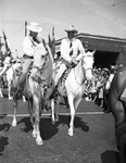 Amon Carter, Sr. (left) and actor Gary Cooper (right) ride on horseback in the parade for the film premiere of the 1940 film the "The Westerner".
