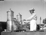 A. L. Barrington, serving coffee in his apron at Camp Brownwood. He has set up a small-scale restaurant on the back of a truck parked just inside the camp's main gate.