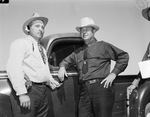 Camp Brownwood's W. O. Finley of Spur, Texas, in charge of the gates, and H. L. Dorman, Big Spring, Texas, right, chief of guards. These two mean head a force of more than 70 armed ex-peace officers who patrol the camp day and night.