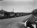 A view of the principal camp street of 15-year-old Camp Wolters, showing the rock-veneered mess halls on the left. Shown are buildings in a line and a plain pathway.