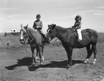 Feeders from the Corn Belt States and livestock admirers in general are traveling a long distance to attend the annual Highland Hereford Feeder Cattle Show in Marfa, Texas. Enjoying the festivities, left to right are Wertie and Martha Loraine Love, son and daughter of Mr. and Mrs. W. E. Love. The children are riding two saddled horses. Wertie is dressed in a button-up shirt and trousers. Martha Loraine is wearing a satin, button-up blouse and trousers. There is a truck parked in the background. Published in the Fort Worth Star-Telegram morning edition, October 8, 1940.