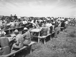 Feeders from the Corn Belt States and livestock admirers in general are traveling a long distance to attend the annual Highland Hereford Feeder Cattle Show in Marfa, Texas. Visitors are shown feasting at the W. E. Love Ranch where lunch was served. Pictured here are picnic tables filled with guests eating. In the background is the serving line for food and beyond is a parking lot. Published in the Fort Worth Star-Telegram morning edition, October 8, 1941.