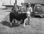 Texas Boys and Their Baby Beeves at the Texas State Fair -- Texas 4-H Club boys and members of the Future Farmers of America showed baby beeves at the State Fair of Texas junior livestock show this week that made competition hard in the junior classes and not easy in the open classes. Here is one of the good calves that demonstrates the boys' ability to feed cattle properly. Three San Antonio 4-H Club boys are pictured here with a mighty good calf that was brought to the Dallas show from San Antonio. Three boys are, left to right, Jack Crea and David Straus, who also showed calves at Dallas, and Johnny Hoffman, who fed this calf. Jack is wearing a button-up shirt with cuffed sleeves and trousers. David is dressed in a cowboy hat, collared shirt with rolled sleeves, and trousers. Johnny is wearing a cowboy hat, dress shirt, and trousers. Automobiles are parked in the background. Published in The Fort Worth Star-Telegram morning edition, October 13, 1940.