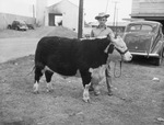 Texas Boys and Their Baby Beeves at the Texas State Fair -- Texas 4-H Club boys and members of the Future Farmers of America showed baby beeves at the State Fair of Texas junior livestock show this week that made competition hard in the junior classes and not easy in the open classes. Here is one of the good calves that demonstrates the boys' ability to feed cattle properly. G. C. Whatley Jr. of Groome and the fourth prize club calf in the weighty division at Dallas are shown here. Young Whatley will take this calf to the 1940 American Royal at Kansas City. G. C. Whatley is wearing cowboy hat, button-up shirt, and trousers. There is a car parked behind him. Published in The Fort Worth Star-Telegram morning edition, October 13, 1940.