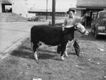 Texas Boys and Their Baby Beeves at the Texas State Fair -- Texas 4-H Club boys and members of the Future Farmers of America showed baby beeves at the State Fair of Texas junior livestock show this week that made competition hard in the junior classes and not easy in the open classes. Here is one of the good calves that demonstrates the boys' ability to feed cattle properly. Delbert Parmelly, Abilene 4-H Club boy, and his second prize baby beef in the light weight division are shown here. Delbert is wearing a cowboy hat, striped button-up shirt, and trousers. He is holding the calf's halter. Cars parked in the background. Published in The Fort Worth Star-Telegram morning edition, October 13, 1940.