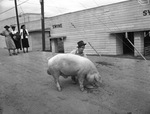 Hale Center Hogs That Won at State Fair - Three of the Chester White hogs with which E. D. Heath & Sons of Hale Center practically swept the Chester White division of the State Fair of Texas hog show at Dallas last week. Junior champion boar of the breed is pictured here. The man with this boar is Aaron Gritzmaker, of Gritzmaker Brothers of Lahoma, Oklahoma, new owners of the entire Heath show herd which was sold to them at the conclusion of the state fair judging. Mr. Gritzmaker is kneeling beside and feeding the boar. He is dressed in a tilted hat, button-up shirt, and trousers. Three African American women are seen standing in the background and looking at the boar. Background showing the Livestock building. Published in The Fort Worth Star-Telegram morning edition, October 17, 1940.