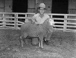 Some Outstanding Sheep and Lambs at Dallas -- One of the outstanding sheep and lambs that took the eye of the Chuck Wagon Gossiper at the State Fair of Texas last week is shown here. Victor Lindley, 4-H Club boy of Big Lake, holding one of the group of lambs that came from Reagan County and ranked second in that division. Victor is kneeling beside the lamb. He is wearing a cowboy hat, button-up shirt with cuffed sleeves and trousers. There is a wooden fence and a barn behind him. Published in The Fort Worth Star-Telegram morning edition, October 14, 1940.
