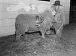Some Outstanding Sheep and Lambs at Dallas -- One of the outstanding sheep and lambs that took the eye of the Chuck Wagon Gossiper at the State Fair of Texas last week is shown here. The Champion Corriedale ram of the show, that was exhibited by H. C. Noelke of San Angelo and Sheffield is shown with S. T. Burnham. There is champion ribbon on the ram. Mr. Burnham is kneeling next to the ram. He is wearing eyeglasses, hat, button-up shirt with rolled sleeves and trousers. There is some hay on the floor. Published in The Fort Worth Star-Telegram morning edition, October 14, 1940.