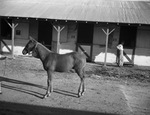 Winning Mare and Colt at State Fair -- A mare and her colt took high honors in the horse show at the State Fair of Texas. Rex Elkins III, is a 6 month-old chestnut walking horse belonging to Joe D. Johnson of Fort Worth that won first place in his class and became the junior champion saddle stallion of the fair. Rex Elkins III was sired by Johnson's walking show horse, Rex Elkins Jr., out of his mare, Fanny Elkins. Mare Fanny is another winner at the fair. Colt Rex Elkins III, is shown here. Someone off camera is holding Rex's lead rope. The stable is in the background. Published in The Fort Worth Star-Telegram morning edition, October 20, 1940.
