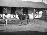 Winning Mare and Colt at State Fair -- A mare and her colt took high honors in the horse show at the State Fair of Texas. Mare Fanny Elkins won second in her class for mares 4 years old and older at the fair. She belongs to Joe D. Johnson of Fort Worth. Fanny is shown here. A man wearing a hat, button-up shirt with cuffed sleeves, and trousers is standing near Fanny's halter and holding the lead rope. The stable is in the background and horses are sticking their heads out of stall twenty-two and twenty-three. Published in The Fort Worth Star-Telegram morning edition, October 20, 1940.