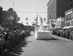 The West Texas Fair is being held in Abilene, Texas. Opening the second day of the fair, Children's Day, is a parade. The parade is one of the largest and most colorful in the history of Abilene. The "Lady Liberty" float is shown traveling down the crowded streets. The Business and Professional Women's club built the float, which took home third prize. Published in the Fort Worth Star-Telegram morning edition, October 10, 1940.