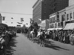 The West Texas Fair is being held in Abilene, Texas. A parade is opening Children's Day, the second day of festivities. The parade is one of the largest and most colorful in the history of Abilene. Surviving the ravages of time and traveling down the parade street, is the early day stage coach of Albany Fandangle. The coach is being pulled by four horses. A group of people are sitting on top the coach. A man is riding shotgun and carrying a shotgun. Other cowboys on horses follow the stagecoach. Spectators line both sides of the street while others view the parade from the buildings. Published in the Fort Worth Star-Telegram morning edition, October 10, 1940.