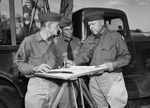 Cannon fire resounded near Newcastle, Texas as the 131st Artillery continued their preview of activities preceding encampment at Camp Bowie in Brownwood, Texas. Left to right are Sergeant L. C. Cambell, Private J. O. Brandenburg Junior, and Captain A. A. Files. They are making up a firing charge on a make-shift table in the field. Captain Files, Battery F commander, is showing the others how they missed the target on the first show. The three men are dressed in their military uniforms. There is a truck in the background. Published in the Fort Worth Star-Telegram morning edition, October 14, 1940.