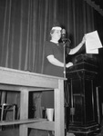 In a ceremony at Paschal High School, 114 chief registrars of Tarrant County took the oath of office. Mrs. Happy Shelton, a Tarrant County clerk, is shown at the microphone. She is explaining to the registrars one of the printed forms that will be used for men between the ages of 21 and 35, to enroll for military service. As a county clerk, Mrs. Shelton is in charge of setting up the registration machinery. She is wearing a hat, dress, and a necklace. Published in the Fort Worth Star-Telegram morning edition, October 11, 1940.