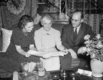 Mrs. W. R. Schick, center, with her son and daughter-in-law, Mr. and Mrs. W. L. Schick. Mrs. W. R. Schick arrived in Fort Worth, Texas, for a visit after a recent trip from the Philippine Islands to California, and a train trip to Fort Worth, Texas. The elder Mrs. Schick is wearing a short sleeve dress and is looking at a paper document or photograph with her daughter-in-law and son. Mrs. W. L. Schick is wearing a polka-dot dress and Mr. W. L. Schick is wearing a suit. They are all sitting on a sofa, and a staircase can be seen in the background.