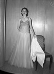 A selection of evening fashion is featured from different Fort Worth stores as there is preparation for varied beauty next month at the Assembly ball and Steeplechase ball. Style-show model Nelle Allen is wearing a pink and blue rainbow net-over-taffeta gown with an iridescent beaded bodice. She is also holding a fringed shawl. Published in the Fort Worth Star-Telegram morning edition, October 27, 1940.