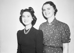 Misses Dorothy Delle Couch (left) and Mackye Bob Hart, play leading roles in "The Family Upstairs," a three-act comedy about a typical American household, to be presented by the Footlite Club at the First Methodist Church on October 23 under the direction of Myrtle Dockery. Miss Delle is wearing a long-sleeve black dress with a pearl necklace. Miss Hart is wearing a polka-dot dress. The women are standing next to each other at an angle, in front of a wall. Published in the Fort Worth Star-Telegram evening edition, October 22, 1940.