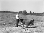 Joe D. Johnson of Fort Worth is developing a remarkable ranch property on 3,000 acres of the Northeast Texas land utilization project north of Bonham in Fannin County on which he has a grazing permit from the United States Government through the Soil Conservation Service which is operating the project. Shown here is Mr. Johnson with his registered Jersey cow, Model Lad Vi, one of the prize winners in the recent State Fair of Texas at Dallas. He is standing next to his cow by the pond. He is wearing a white collared shirt, a tie, pants, and a hat. Published in the Fort Worth Star-Telegram morning edition, October 29, 1940.