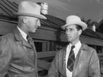 J. P. Osborne Hereford Cattle Sale attendees Glenn Ross of Goodlett, Texas (left) and J. C. Webb of Marion, Alabama. Both men are wearing leather jackets, and hats. Published in The Fort Worth Star-Telegram Morning Edition November 04, 1940.