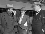 J. P. Osborne Hereford Cattle Sale attendees Jack Frost, owner of the White Hat Ranch (left) Bob Mousel of the firm of Mousel Brothers, of Cambridge, Nebraska (center) and F. W. Fischer of Tyler, Texas. All men appear to be having a conversation, wearing suits, and hats. Published in The Fort Worth Star-Telegram Morning Edition November 04, 1940.
