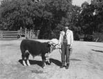 The Second Annual Auction Sale of the Central Texas Hereford Breeders' Association was held at Belton, Texas on November 1, attracted many persons interested in the livestock industry. Shown here are participant Charles S. Cox Junior, Temple, Texas, with his young bull, Beau Anxiety 19th. Mr. Cox Junior sustaining Beau from his halter rope. Published in the Fort Worth Star-Telegram morning edition, November 3, 1940.