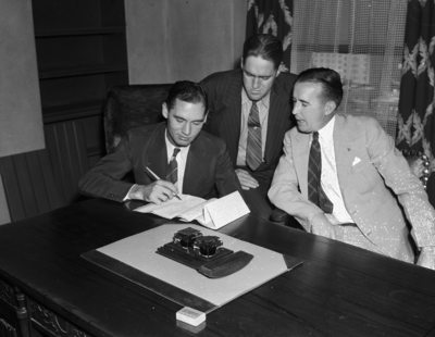The Texas State Democratic Convention is getting under way in Mineral Wells, Texas. Left to right are, Obel McAlister, Clinton Kersey, and Homer Leonard. Mr. Leonard, of McAllen, Texas, is getting a couple more endorsements to his candidacy for the Texas House speaker-ship. He is dressed in a light colored suit. Mr. McAlister of Fort Worth, Texas, is signing up as a Representative. He is dressed in a dark suit. Mr. Kersey of Bridgeport, Texas, is crouching between the two chairs, awaiting his turn to sign on. He is dressed in a pinstripe suit.